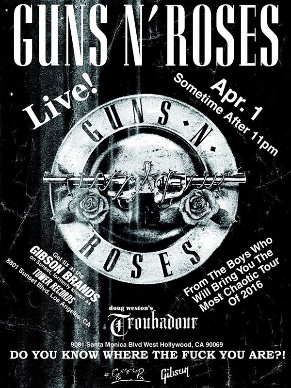 Pero el plato fuerte llega el 31 de Marzo, cuando los rumores que circulaban sobre un posible concierto «sorpresa» de GN’R al día siguiente en el Troubadour de Los Angeles, uno de los locales de Sunset Strip que les vio nacer, finalmente se confirman. Twitter se pone en marcha y en pocos minutos ya hay docenas de personas haciendo cola en la antigua tienda de Tower Records, mítica cadena de tiendas de discos para la que en su momento trabajaron tanto Slash como Axl, y que hoy en día es un showroom de la marca de guitarras Gibson. El concierto del Troubadour y los tickets en Tower Records a 10$ se viralizan en Twitter, y alguna entrada llega a ser ofrecida en sitios web de reventa de entradas a precios desorbitantes, pese a que son pulseras (una por persona de la cola) y no se pueden quitar de la muñeca sin romperlas.